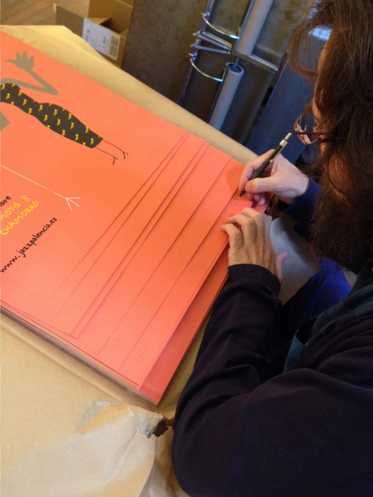 El ilustrador Mauro Entrialgo firmando la edición limitada de 70 serigrafías numeradas del magnífico cartel (en formato 50×70 cm) que nos ha diseñado para el II Jazz Palencia Festival. Se pondrán a la venta a un precio excepcional (50 €) esta semana a través de Internet en esta misma página, en la Librería Ateneo (C/ Juan de Castilla, 3 – Palencia) y Librería del Burgo (C/ Marqués de Albaida, 3 – Palencia). También estarán disponibles en los conciertos del Teatro Principal y de la Fundación Díaz-Caneja.