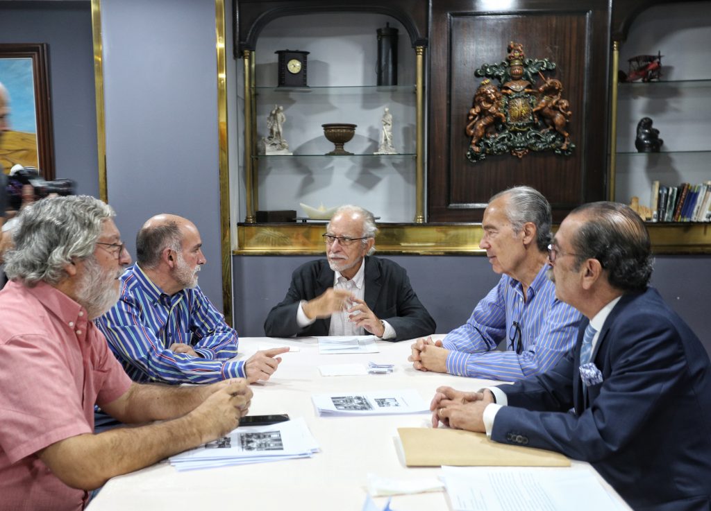 De izquierda a derecha, José Miguel López, José Ángel Zapatero, José María Merino, Luis Alberto de Cuenca y Guillermo Ramos, durante la reunión del jurado del III Premio Internacional ‘Ramos Ópticos’ al mejor relato sobre jazz, celebrada ayer en el Hotel Castilla Vieja de Palencia.